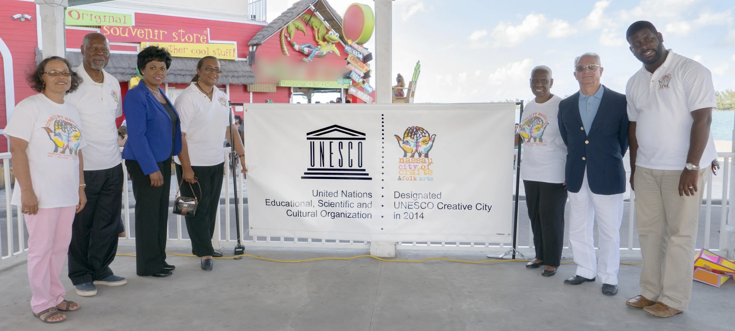 Members of Creative Nassau, along with Executive Members of the Downtown Nassau Partnership officially unveiled the UNESCO Creative Cities Network Banner at the Creative Nassau Pompey Square Market in March 2015. Left to right: Pam Burnside CN President, Dr Davidson Hepburn, CN Secretary, Vernice Walkine DNP, Patricia Glinton Meicholas, CN Vice President, Rosemary Hanna, Charles Klonaris and "Mayor" Gevon Moss of the DNP.